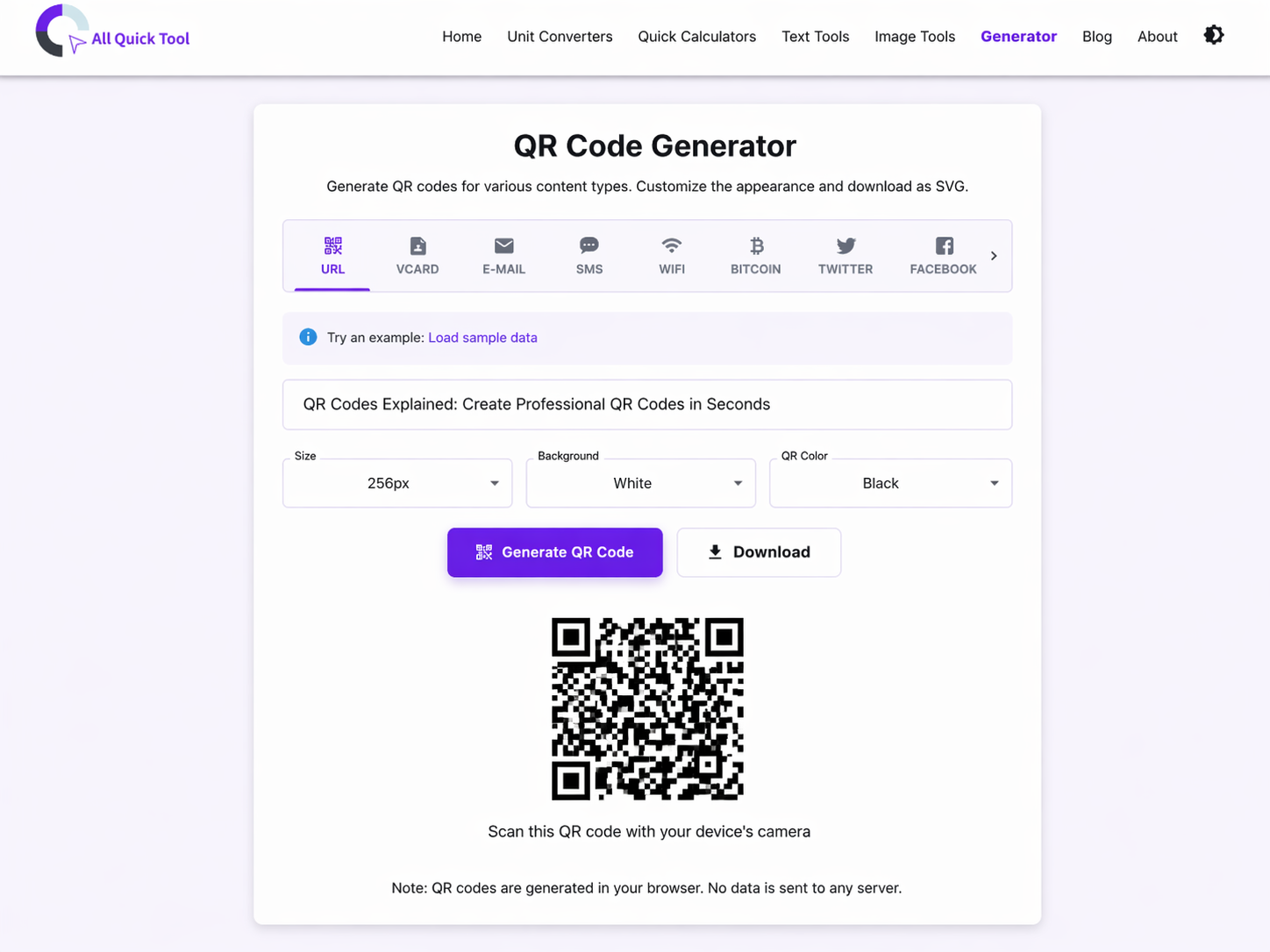 QR codes bridge the physical and digital worlds. With All Quick Tool, generate professional QR codes instantly for any purpose - completely free and private!